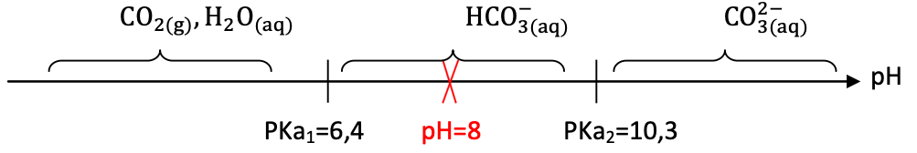 • couple ion hydrogénocarbonate / ion carbonate : pKA (HCO3 (aq) / CO32-(aq)) = 10,3.
