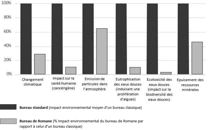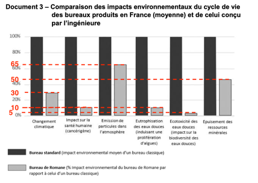 Document 3 – Comparaison des impacts environnementaux du cycle de vie des bureaux produits en France (moyenne) et de celui conçu par l’ingénieure