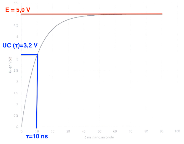 Le temps caractéristique, τ, correspond à la durée nécessaire pour atteindre 63 % de la tension finale aux bornes du condensateur.