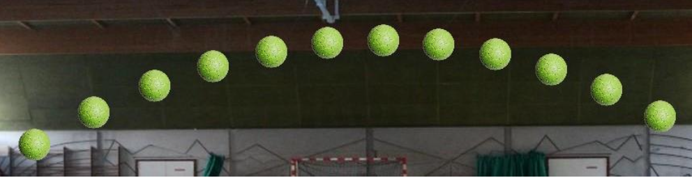 Un « jet de 7 mètres » a été reproduit et filmé au gymnase, la chronophotographie du mouvement du ballon est la suivante :