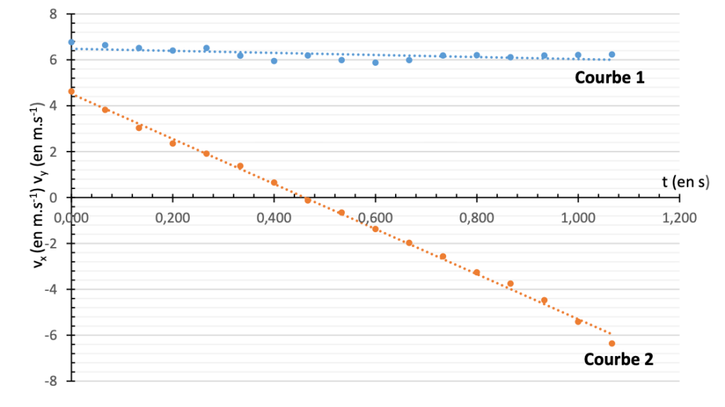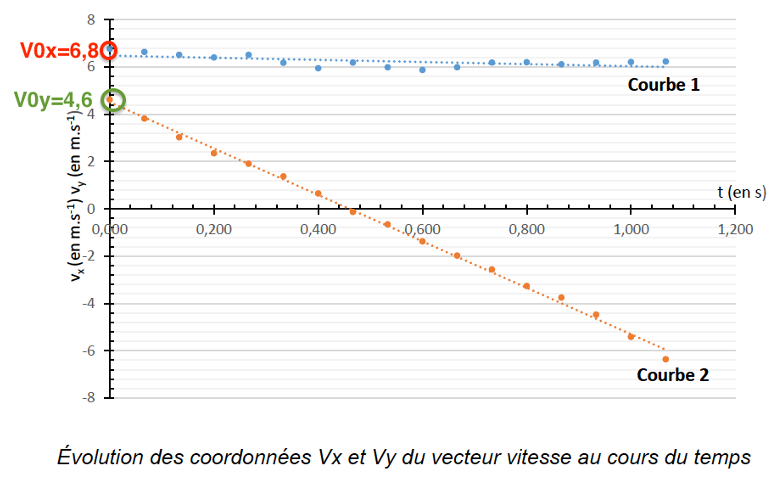 Q.5. Sur le graphique représentant l’évolution des coordonnées du vecteur vitesse au cours du temps, identifier la courbe correspondant à vx et celle correspondant à vy. Justifier.