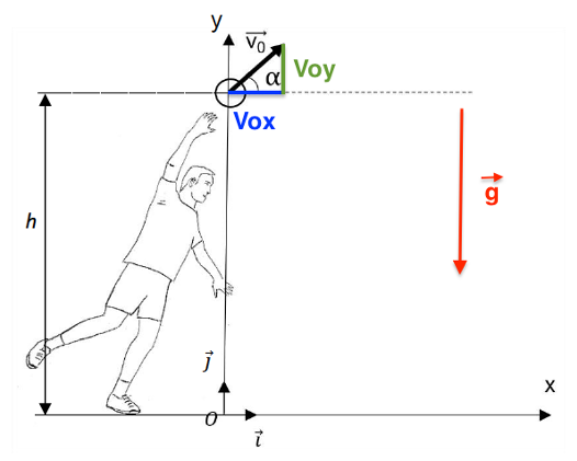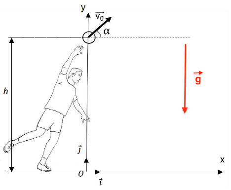 - Le vecteur vitesse initiale$\overrightarrow{V_0}$ du ballon forme un angle α avec l’horizontale.