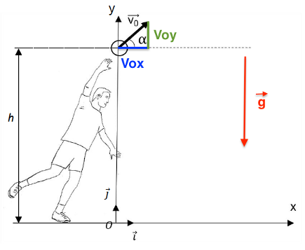 $$\overrightarrow{OG}(t)\left|\begin{matrix}x(t)=v_0\times\cos\left(\alpha\right)\times t\\y(t)=-\frac{1}{2}\times g\times t^2+v_0\times\sin\left(\alpha\right)\times t+h\end{matrix}\right.$$