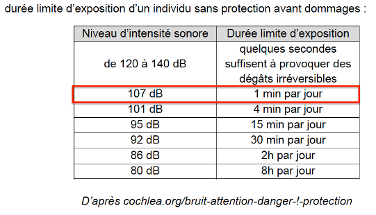 | 107 dB | 1 min par jour |