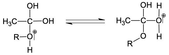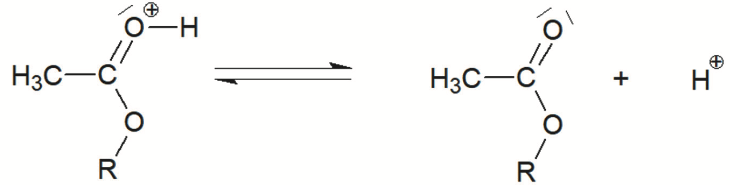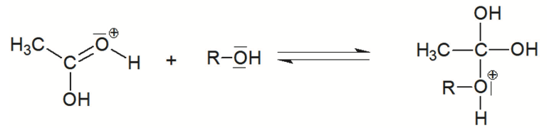 L’éthanoate de géranyle peut être synthétisé en faisant réagir du géraniol avec de l’acide éthanoïque CH3CO2H. Cette transformation chimique, appelée estérification, est lente et non totale. Les étapes du mécanisme réactionnel de cette estérification sont données ci-dessous. Afin de simplifier les écritures, le géraniol est dorénavant noté R–OH et l’éthanoate de géranyle est dorénavant noté CH3COO–R dans toute la suite de l’exercice.