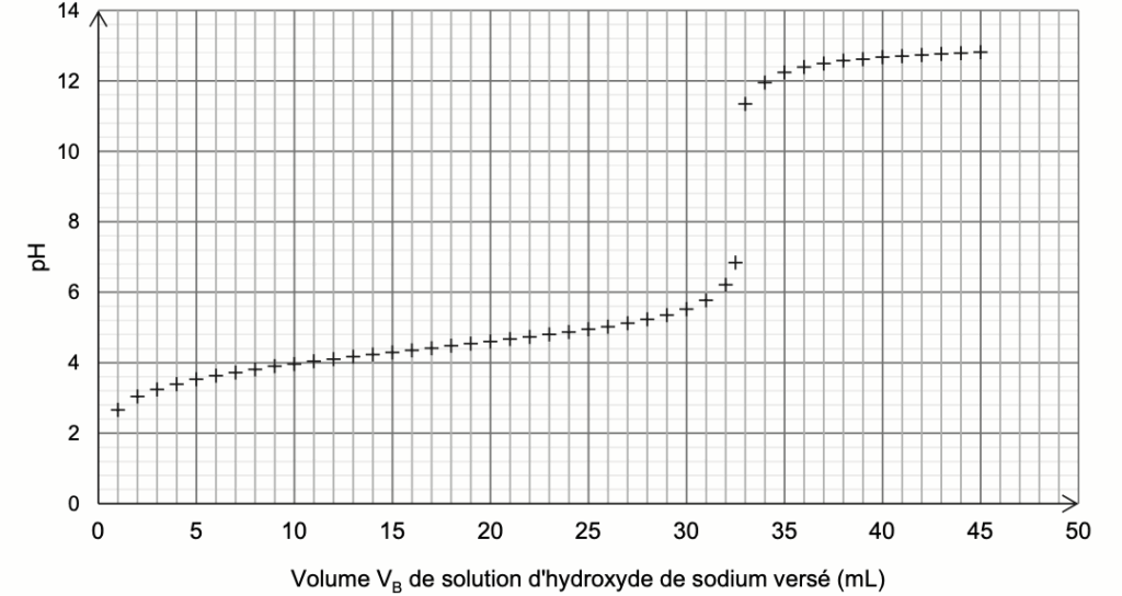 Pour déterminer la quantité d’éthanoate de géranyle formée, on dose l’acide éthanoïque restant dans la phase aqueuse à l’aide d’une solution aqueuse d’hydroxyde de sodium à la concentration CB = 1,0 mol·L–1. Le titrage est suivi par pH-métrie et la courbe obtenue est représentée sur la figure 2.