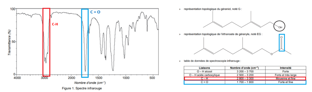 Q2. Attribuer, en justifiant, le spectre infrarouge représenté sur la figure 1 ci-après à la bonne espèce chimique parmi le géraniol et l’éthanoate de géranyle