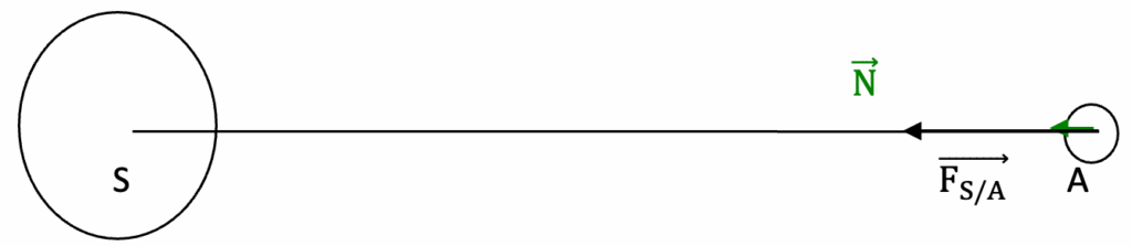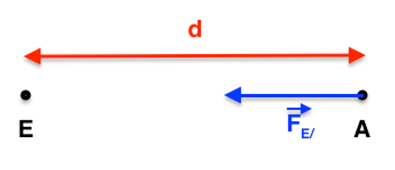 1. Représenter, sans souci d’échelle, la force d’attraction gravitationnelle $\overrightarrow{F_{E/A}}$ exercée par l’engin spatial E sur l’astéroïde A, tous deux considérés comme des points matériels, lorsqu’ils se trouvent à une distance d l’un de l’autre.
