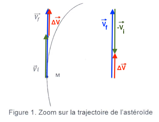 On a représenté sur la figure 1 une portion de la trajectoire de l’astéroïde ainsi que sa vitesse initiale $\overrightarrow{v_i} $ en un point M de sa trajectoire sans présence de l’engin spatial puis le nouveau vecteur vitesse $\overrightarrow{v_f} $ de l’astéroïde juste après l’interaction en présence de l’engin spatial.