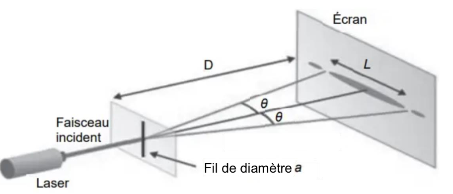 Sur un écran blanc placé à une distance D du fil utilisé, on observe une figure de diffraction. L est la largeur de la tache centrale. θ est l’angle caractéristique de