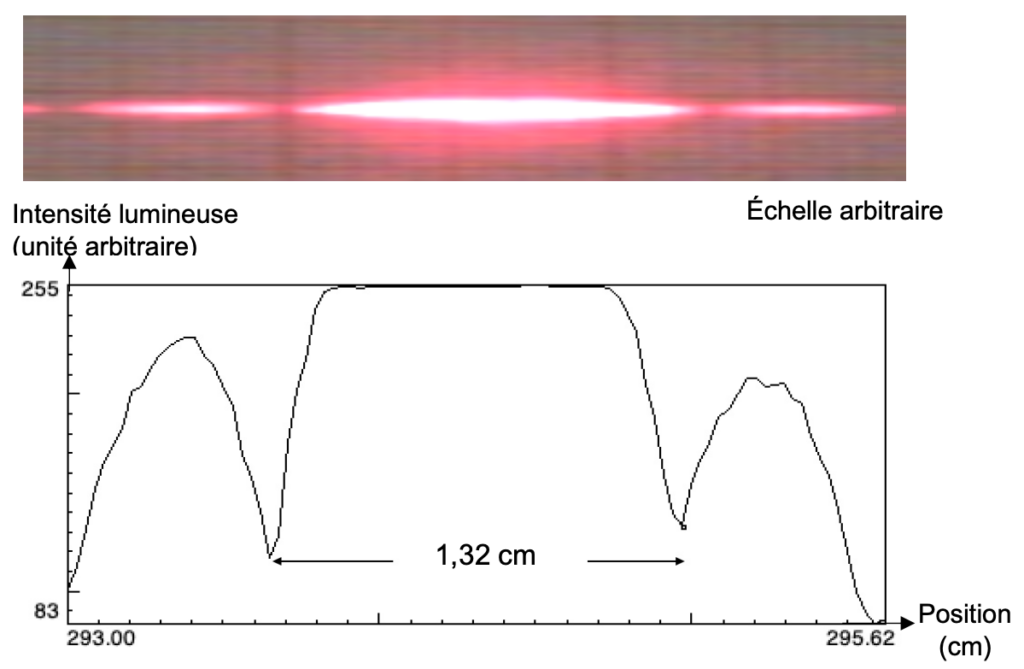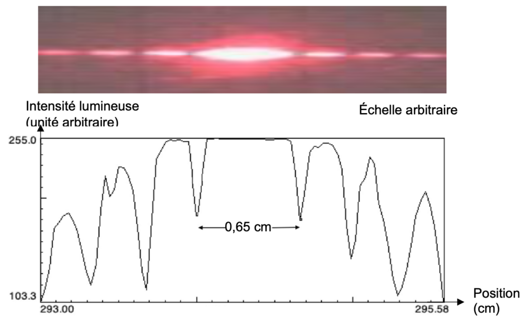 Un logiciel de traitement d’image permet d’obtenir la distribution de l’intensité lumineuse sur l’écran. Les résultats obtenus pour deux fils calibrés utilisés sont présentés ci-après, sur la figure 2, accompagnés des photographies des figures de diffraction obtenues.