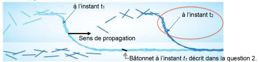 L’énergie mécanique d’un bâtonnet est la somme de son énergie cinétique, de son énergie potentielle de pesanteur (considérée nulle lorsque le bâtonnet est au sol) et de son énergie potentielle élastique (nulle lorsque le bâtonnet n’est pas déformé). Lors de la propagation de l’onde, chaque bâtonnet est propulsé vers le haut et n’est plus déformé. Lorsqu’il atteint sa hauteur maximale, on peut considérer sa vitesse comme nulle.