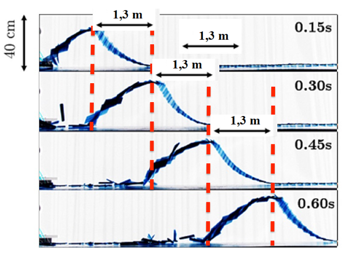 Pour constituer le croisillon (figure 2 ci-dessous), les bâtonnets se déforment avec des fléchissements qui sont de l’ordre de leur épaisseur (figure 3 ci-dessous), mais qui retrouvent leur forme initiale une fois libérés. Initialement, ils stockent ainsi non pas de l’énergie potentielle de pesanteur mais de l’énergie potentielle élastique. Des chercheurs ont montré que l’onde cobra résultait d’une propulsion par réaction, dans laquelle le « carburant » est cette énergie potentielle élastique stockée dans les déformations des bâtonnets et la propagation est assurée par leur éjection.