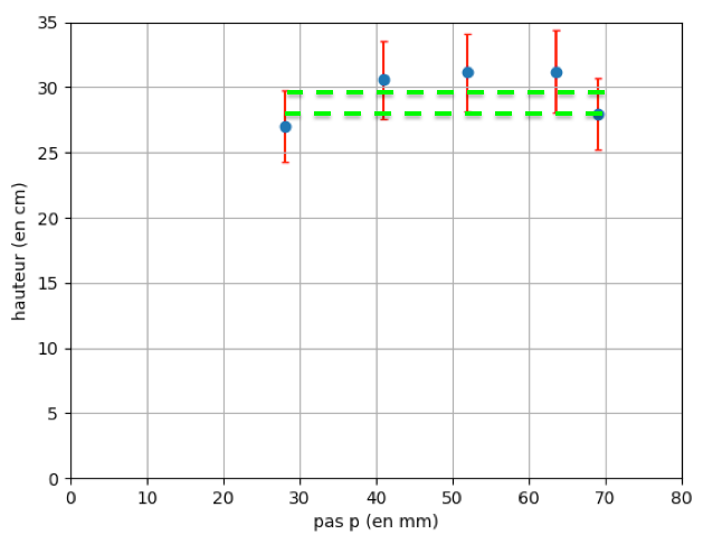 L’évolution de la célérité de l’onde et de la hauteur maximale atteinte par chaque bâtonnet en fonction du pas sont reproduites ci-dessous (pour des bâtonnets de longueur 11,4 cm). Les barres indiquent l’incertitude-type pour chaque mesure.