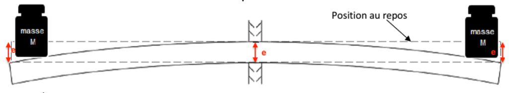8. En déduire la valeur de l’énergie potentielle élastique d’un bâtonnet qui serait déformé de cette façon par les deux masselottes avec un fléchissement égal à son épaisseur à chaque extrémité.