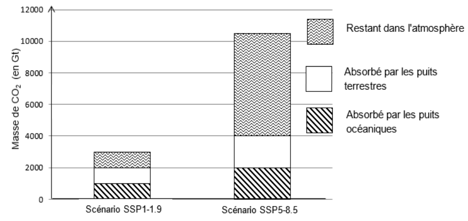 D’après le document 1, pour le Scénario SSP5-8.5 (production anthropique importante de dioxyde de carbone), la masse de CO2 (g) restante dans l’atmosphère est bien supérieure à celle absorbée par les puits terrestres et océaniques.