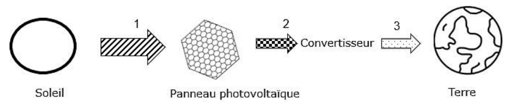 Le rayonnement solaire est capté par les panneaux photovoltaïques de la station solaire spatiale (1). L’énergie produite par le panneau solaire est envoyée vers un convertisseur qui produit des micro-ondes de longueur d’onde égale à 15 cm, comparable aux ondes radio (2). Ces micro-ondes sont envoyées sur Terre et captées par un récepteur qui les transforme en électricité transmise au réseau électrique (3).