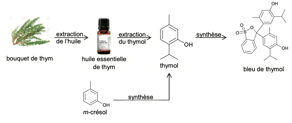 Le bleu de thymol est un indicateur coloré acido-basique de plus en plus utilisé dans les laboratoires. Suivant les recommandations de l’INRS (Institut National de Recherche et de Sécurité), il se substitue en effet à la phénolphtaléine, couramment utilisée auparavant, et qui est désormais classée CMR (Cancérigène Mutagène Reprotoxique). Comme le montre la figure 1, le bleu de thymol peut être synthétisé à partir du thymol, lui-même extrait de la plante de thym ou synthétisé à partir du m-crésol.