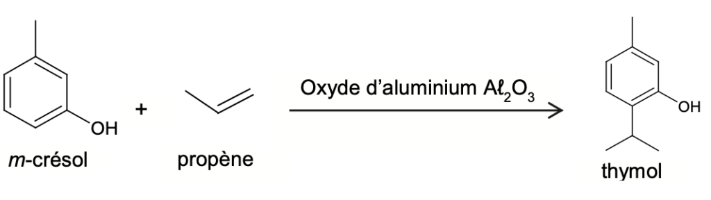 Le thymol utilisé dans les produits pharmaceutiques est principalement obtenu par synthèse. Comme indiqué en figure 3, le thymol peut être industriellement synthétisé à partir de m-crésol et de propène en excès, en présence d’oxyde d’aluminium, qui joue ici le rôle de catalyseur. Cette transformation génère plusieurs produits secondaires et rend complexe l’obtention sélective du thymol.