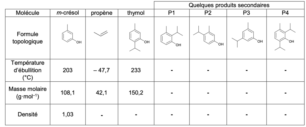 Q11. En considérant le m-crésol comme réactif limitant dans la transformation, dont le rendement est de 73 %, vérifier que le volume de m-crésol nécessaire pour synthétiser 1,0 g de thymol par le procédé de la figure 3 est inférieur à 1 mL.