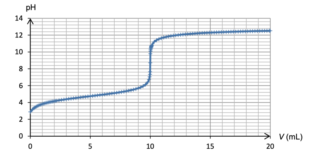 Figure 4. Simulation du titrage de 10,0 mL d’une solution d’un acide faible (acide éthanoïque) de concentration 0,100 mol·L–1 par une solution de base forte (hydroxyde de sodium) de concentration 0,100 mol·L–1