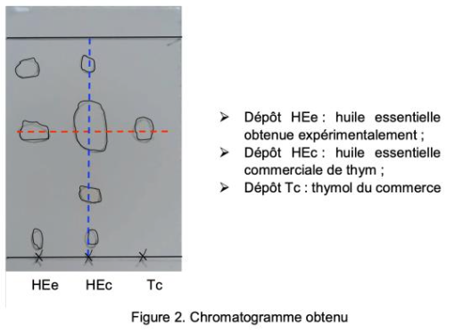 Le dépôt HEc (huile essentielle obtenue expérimentalement) donne 4 taches : c’est donc un mélange. Une des taches est au même niveau que la tache correspondant au dépôt TC (Thymol du commerce) : l’huile essentielle obtenue expérimentalement qui contient du thymol.