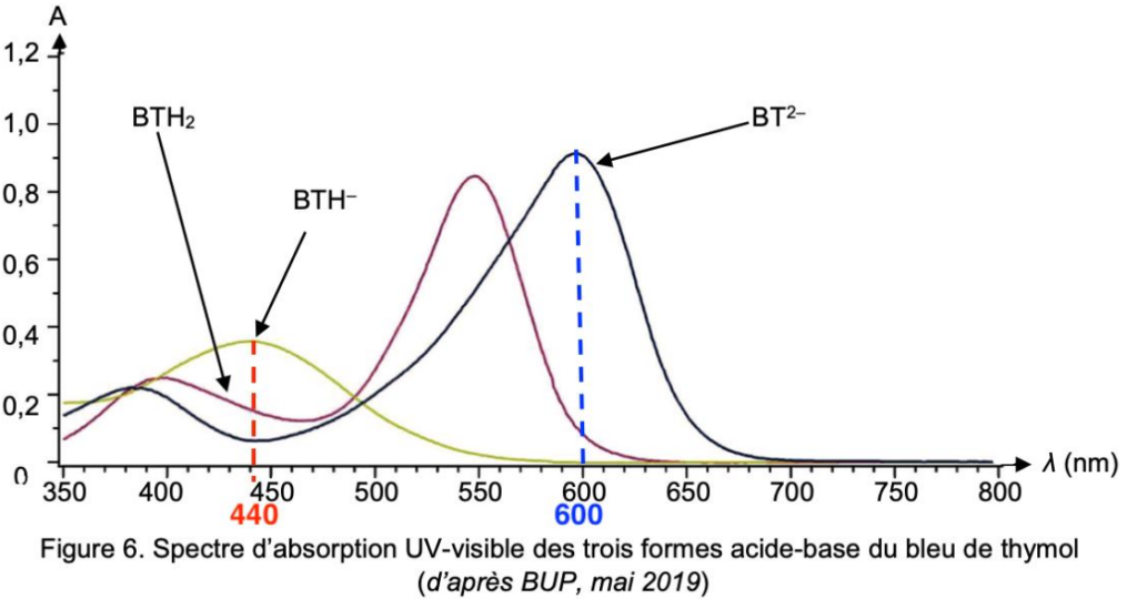 Q14. À l’aide de l’ensemble des informations proposées, déterminer la valeur du pKA du couple BTH–(aq) / BT2–(aq) du bleu de thymol. Justifier que celui-ci puisse remplacer la phénolphtaléine dans nos laboratoires, en précisant le changement de couleur observé lors du titrage d’un acide faible par une base forte.