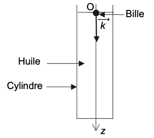 - la force de frottement exercée par l’huile sur la bille, d’expression vectorielle dans les conditions de l’expérience : $\vec{f} = -\alpha,\eta_C,v,\vec{k}$ avec α une constante homogène à une distance, dépendant des paramètres géométriques du système, ηC la viscosité de l’huile C et v la valeur de la vitesse du centre de masse de la bille. On donne α = 1,92×10–2 m.