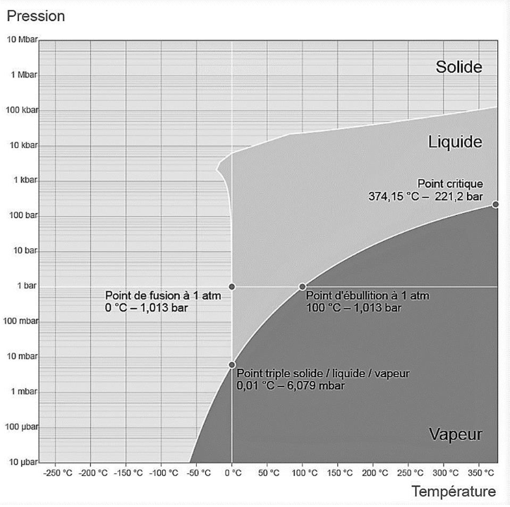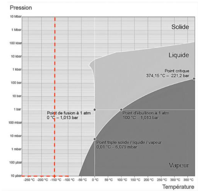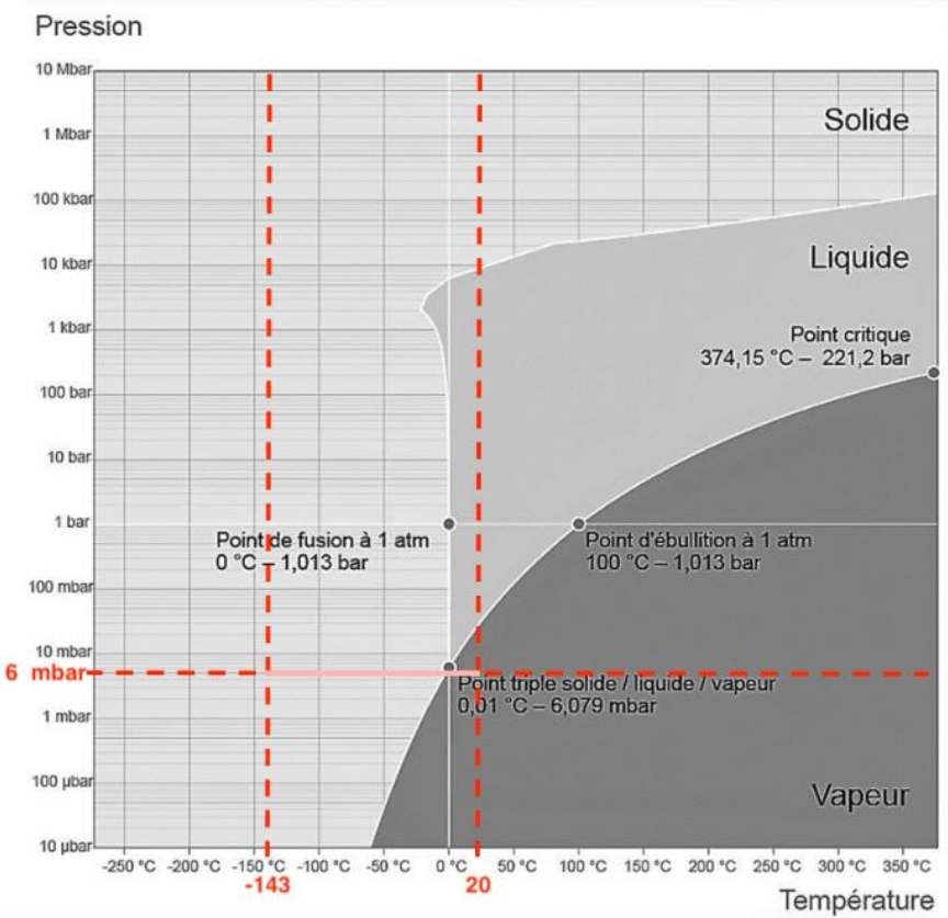 En plaçant la pression et les températures minimale et maximale de Mars sur le document 3, on obtient que l’eau sur Mars peut être solide ou vapeur (la droite de la pression passe sous le point triple).