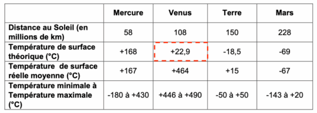 La différence entre la température réelle et la température théorique sur la Terre et sur Vénus est due à l’effet de serre.
