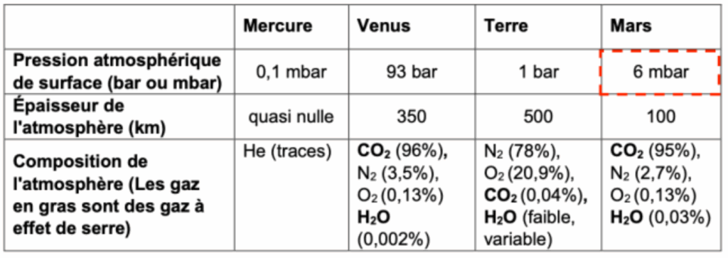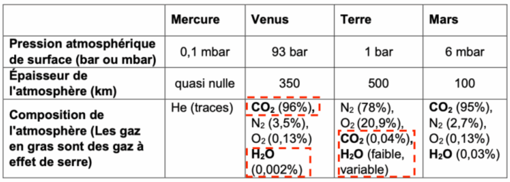 Composition de l’atmosphère (Les gaz en gras sont des gaz à effet de serre) | He (traces) | CO2 (96%), N2 (3,5%), O2 (0,13%) H2O (0,002%) | N2 (78%), O2 (20,9%), CO2 (0,04%), H2O (faible, variable) | CO2 (95%), N2 (2,7%), O2 (0,13%) H2O (0,03%) |