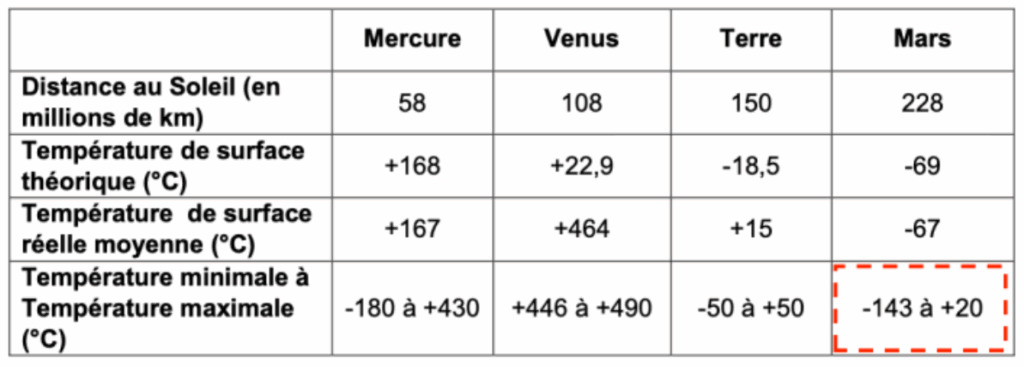 Température de surface théorique (°C) | 168 | 22,9 | -18,5 | -69 |