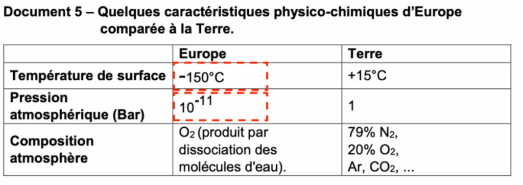 Document 5 – Quelques caractéristiques physico-chimiques d’Europe comparée à la Terre.